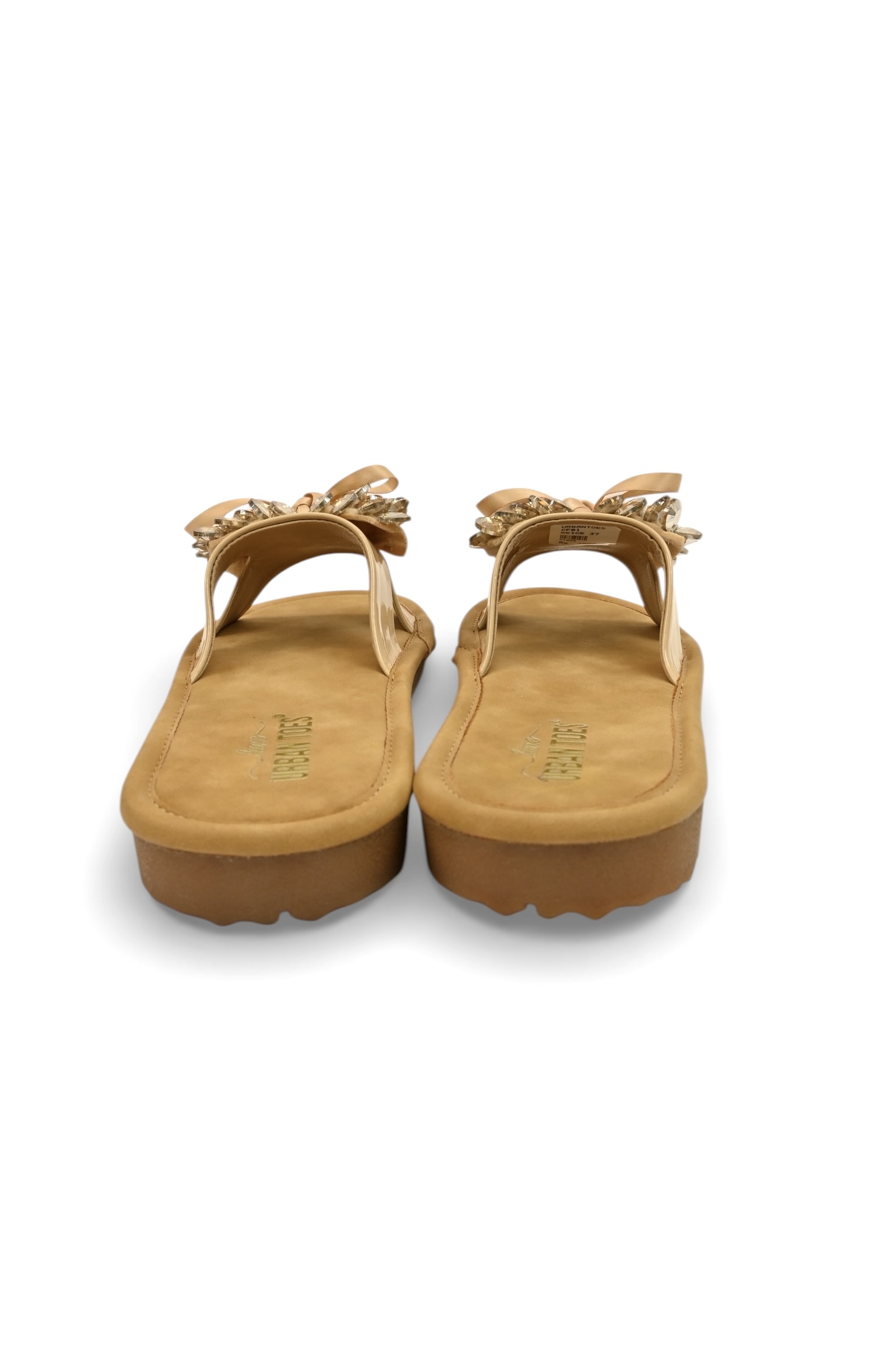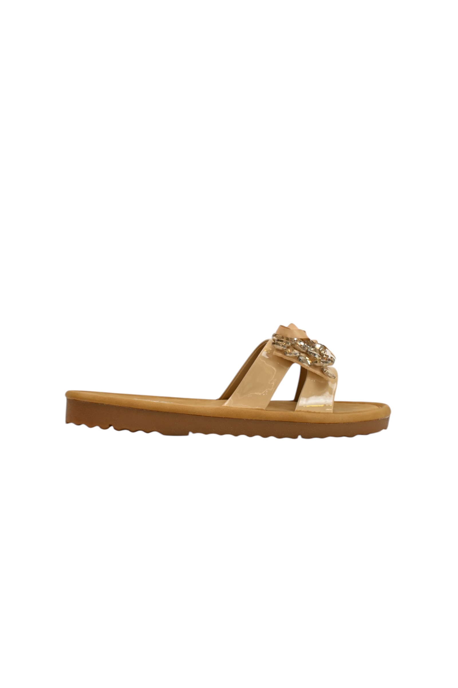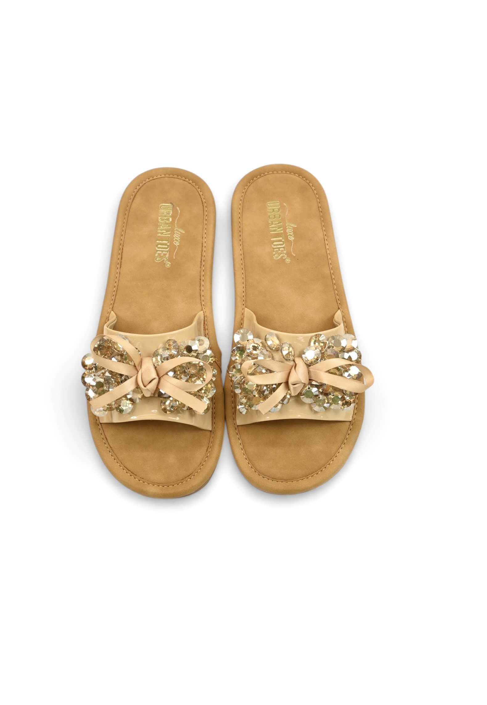 Add a touch of everyday elegance with these Beige Embellished Flat Slide Sandals for Women by UrbanToes, designed for comfort and subtle style. Featuring a glossy upper with crystal embellishments and a delicate bow detail, these flats bring a refined yet casual look perfect for daily wear.
