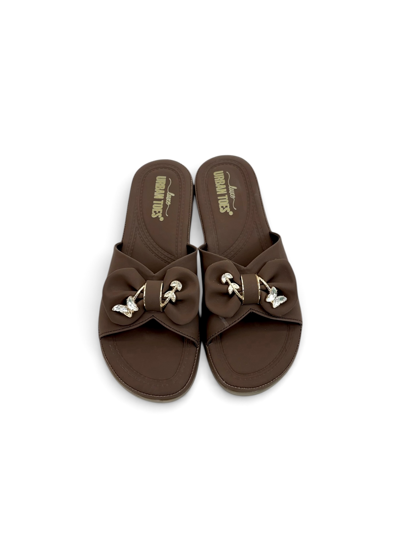 Designed in a rich chocolate brown tone, these chocolate brown casual sandals for daily wear women feature soft bow detailing enhanced with gold-tone chain and crystal accents. The slip-on design ensures convenience, while the refined embellishment adds a subtle statement.