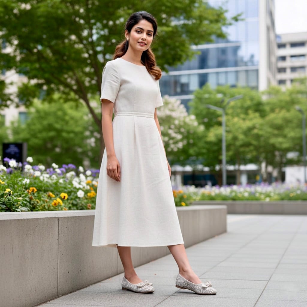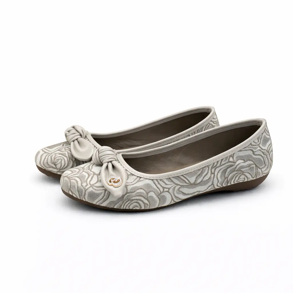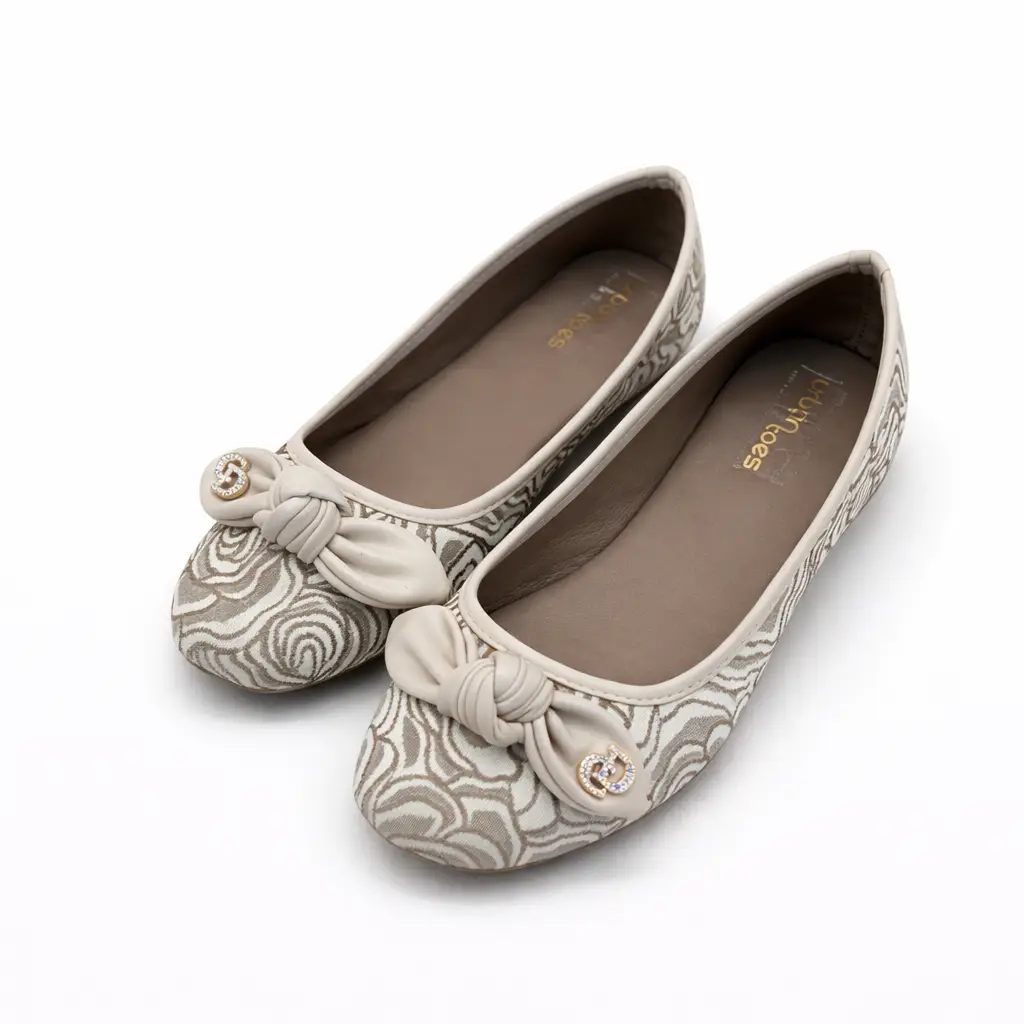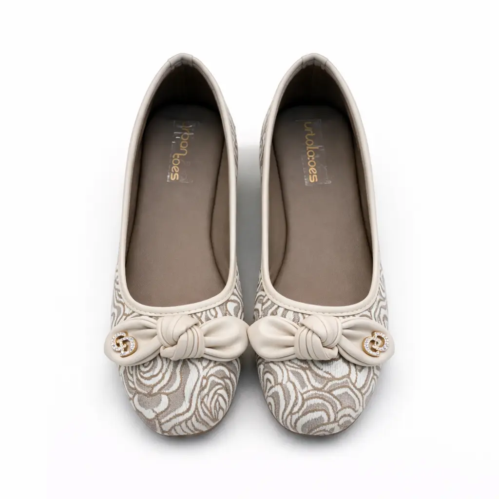 These cream colour ballerina flats for women are stylish and comfortable for daily wear and small functions. The soft printed fabric gives a classy look, while the front knot design adds extra charm.