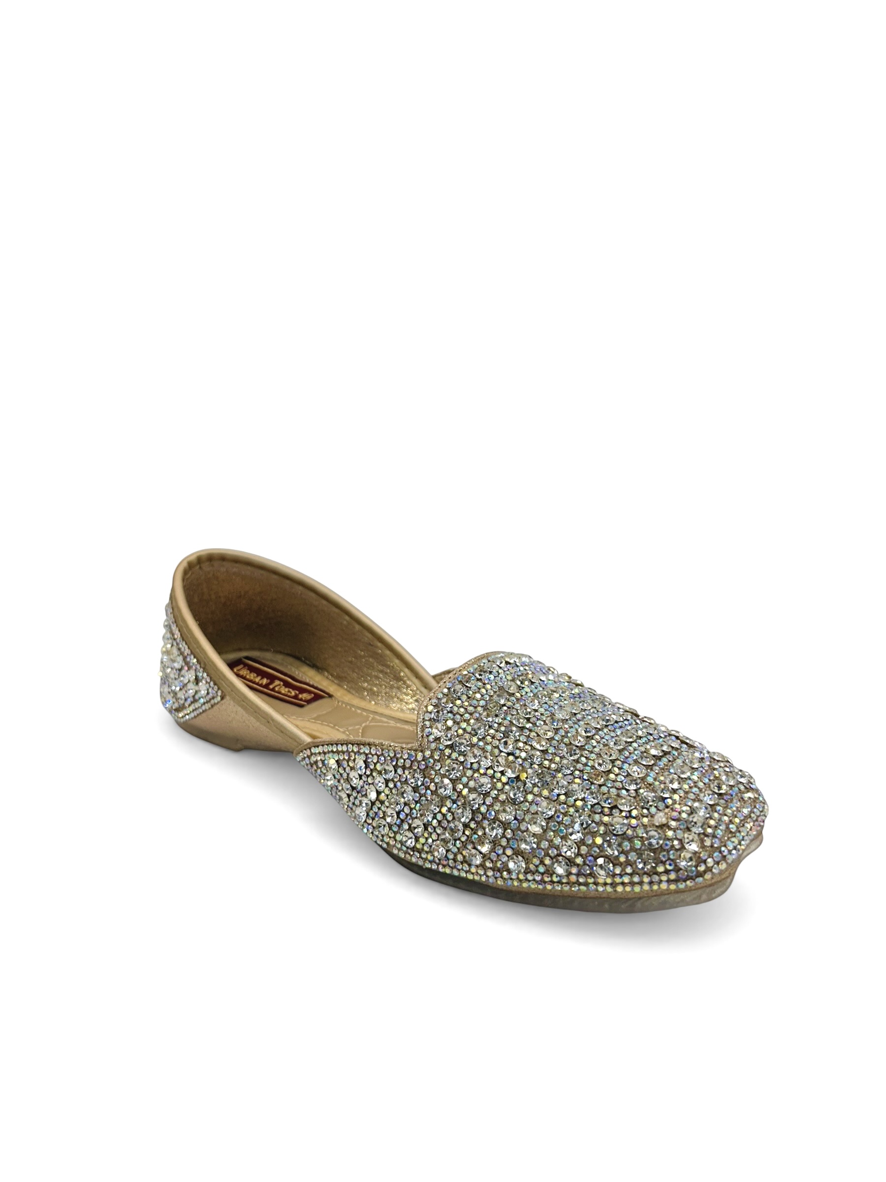 Elegant gold crystal embellished jutti for women with cushioned comfort. Perfect for weddings, festive wear, and traditional outfits.
