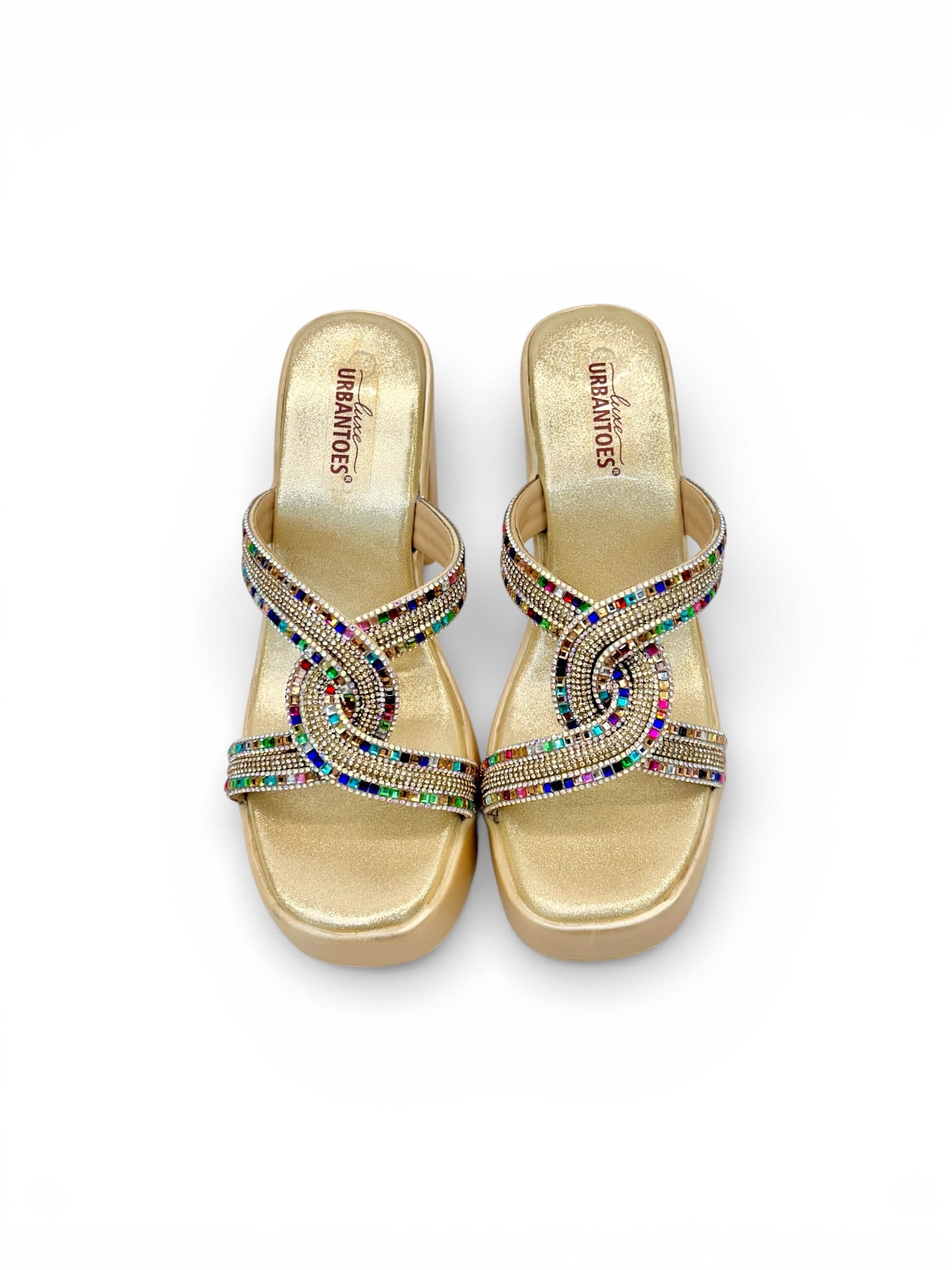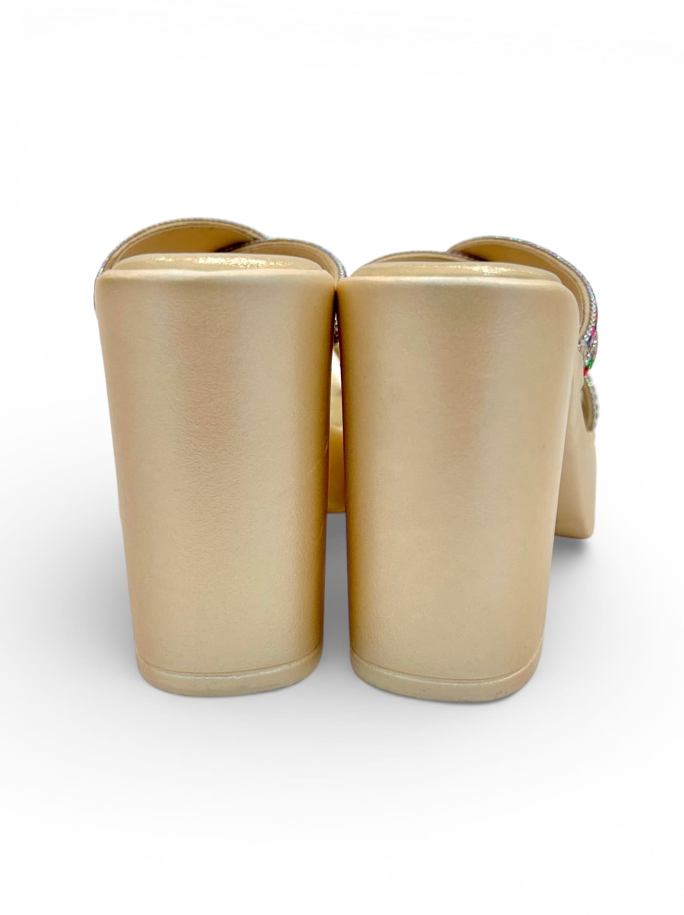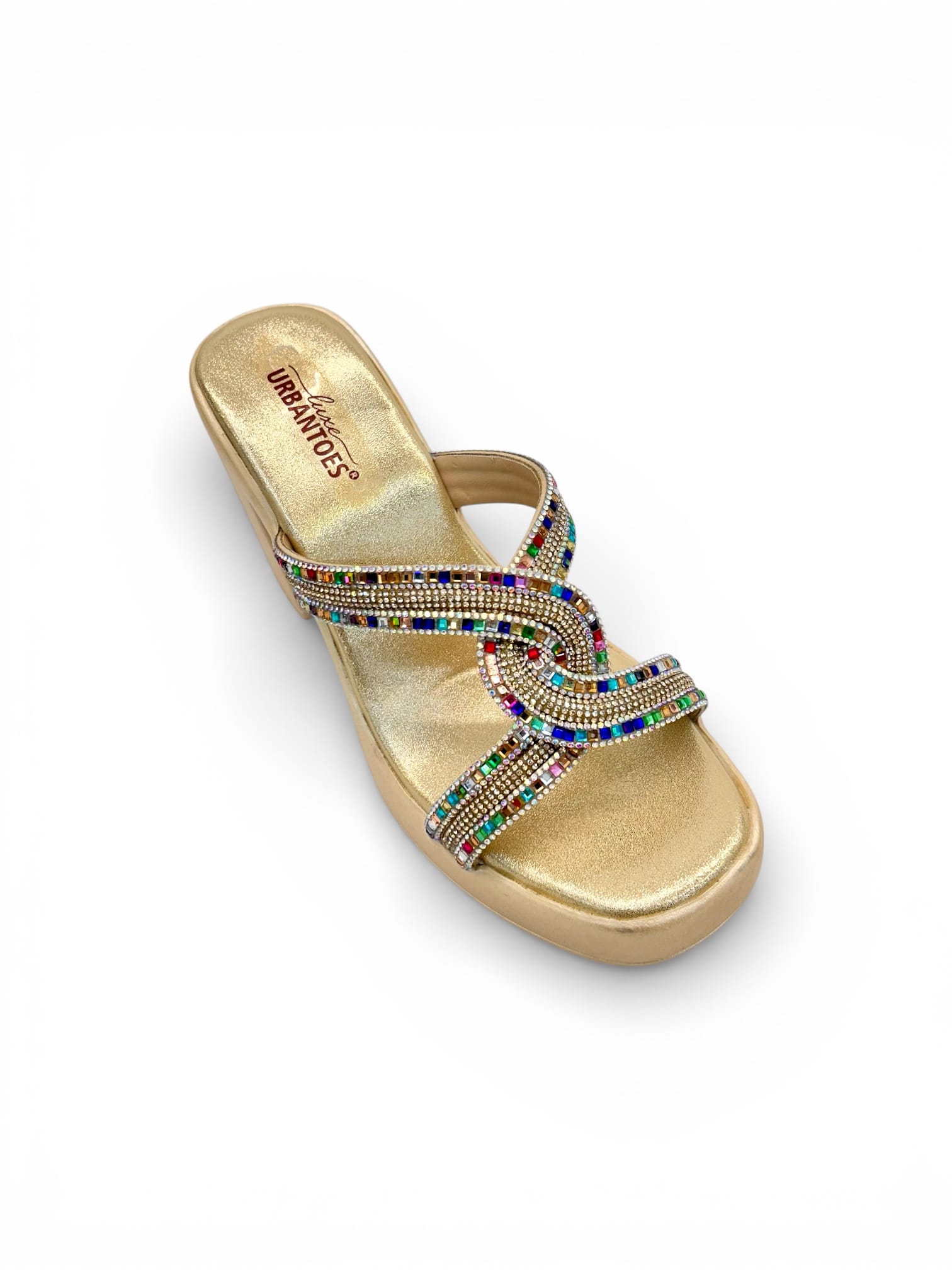 Upgrade your festive look with these elegant Gold Platform Block Heels for Women, designed specially for Indian weddings and celebration wear. Featuring beautifully embellished multicolor stone straps in a stylish criss-cross design, these heels add instant glamour to any ethnic or party outfit.