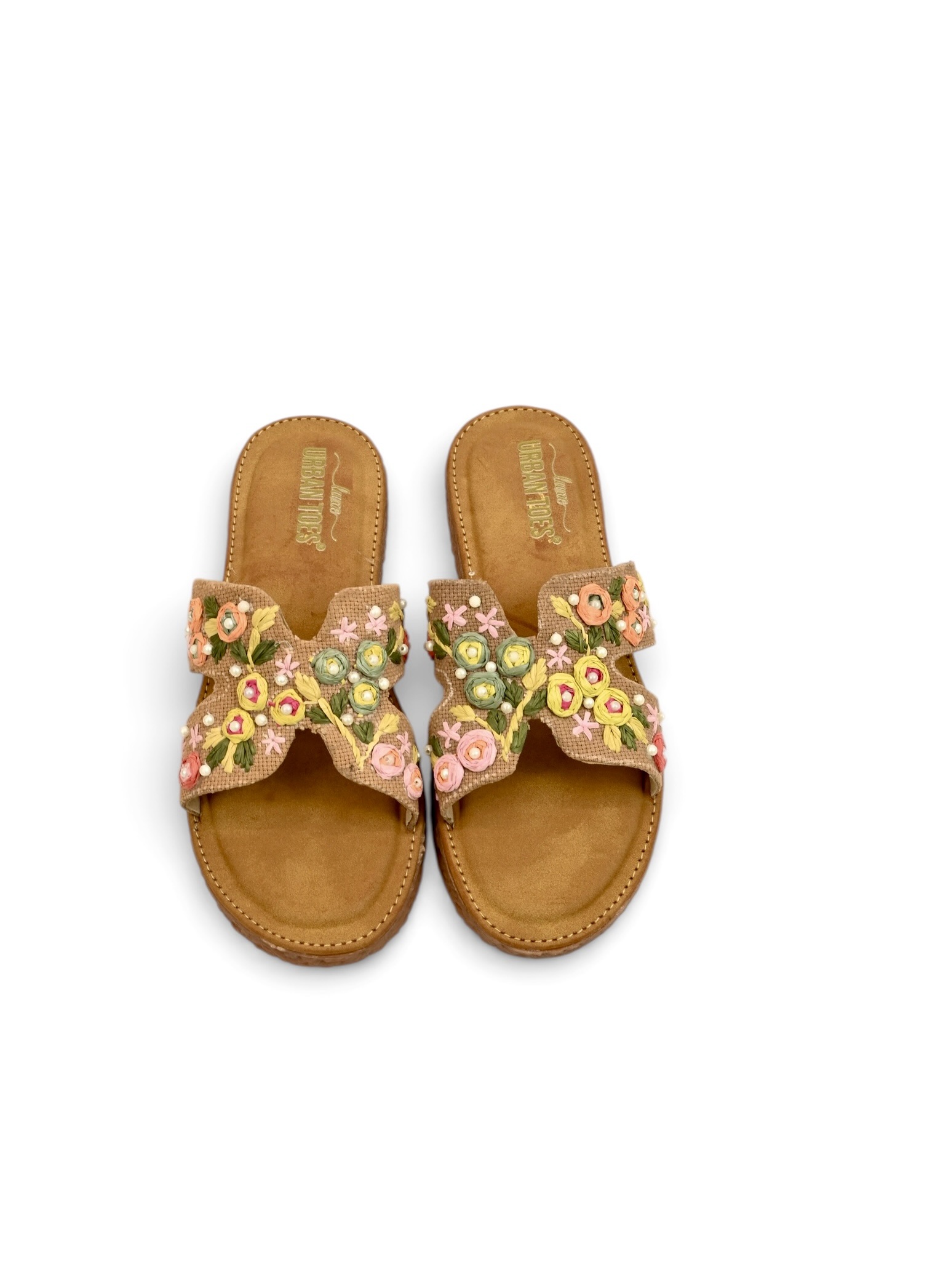 - Upper Material & Embellishments: Jute-textile upper with handcrafted floral thread embroidery, bead accents, and mirror detailing