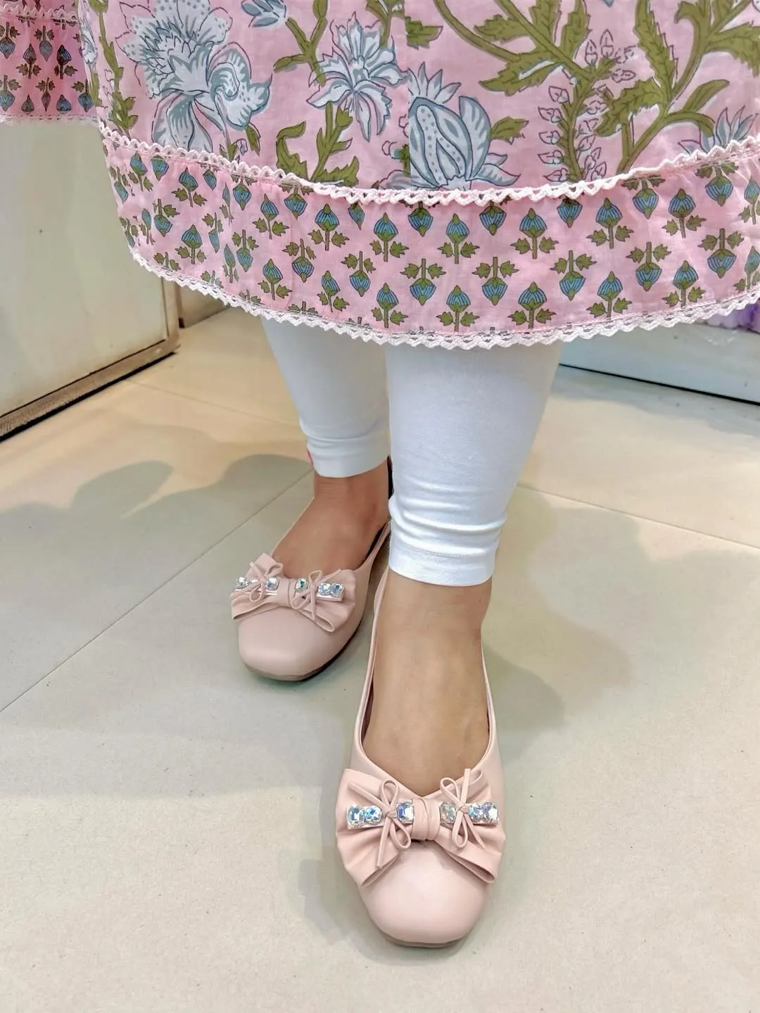 Step into a world of charm with our Peachy Blush Ballerina flats. Featuring a soft pastel hue, a multi-layered fabric bow, and sparkling crystal accents, these flats offer a graceful look that pairs effortlessly with ethnic suits, floral dresses, and smart casuals.