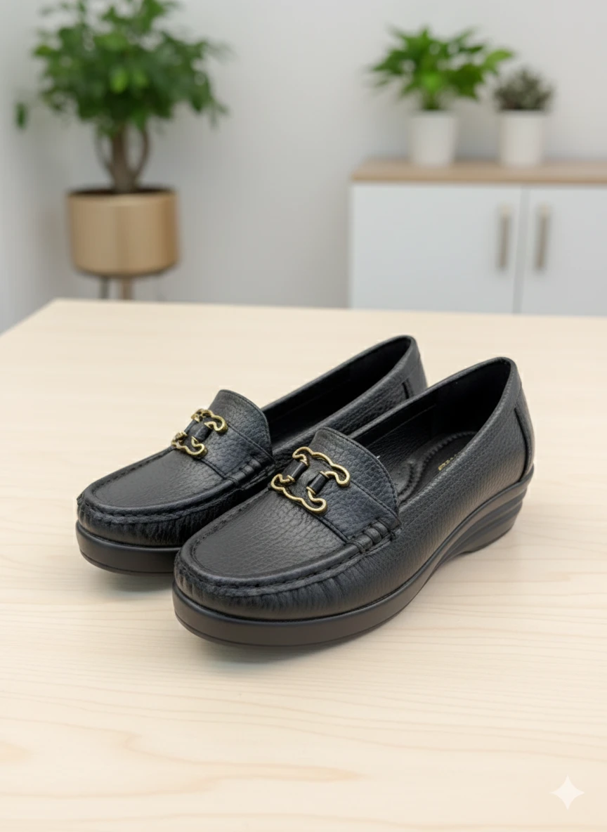 Classic black wedge loafers with gold buckle detail, designed for all‑day comfort and everyday elegance. Perfect for work, casual outings and travel, they pair effortlessly with ethnic and western outfits.