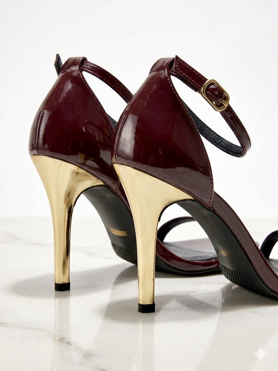 Designed for women who seek both style and practicality, these luxury minimal stiletto sandals for evening wear feature a deep burgundy tone paired with a sleek metallic heel. The open-toe silhouette enhances breathability, making them ideal for Indian weather and global occasions alike.